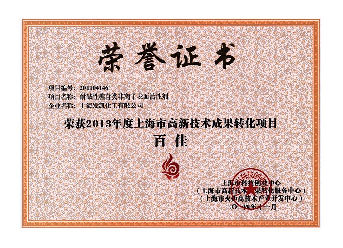 2014年11月20日下午,風(fēng)和日麗,上海市科技創(chuàng)業(yè)中心主辦的“2013上海高新技術(shù)成果轉(zhuǎn)化年會(huì)暨上海市高新技術(shù)成果轉(zhuǎn)化百佳、自主創(chuàng)新十強(qiáng)項(xiàng)目表彰會(huì)”隆重舉行。上海發(fā)凱化工有限公司承擔(dān)的“耐堿性糖苷類(lèi)非離子表面活性劑”再度榮獲“百佳”稱(chēng)號(hào)。
