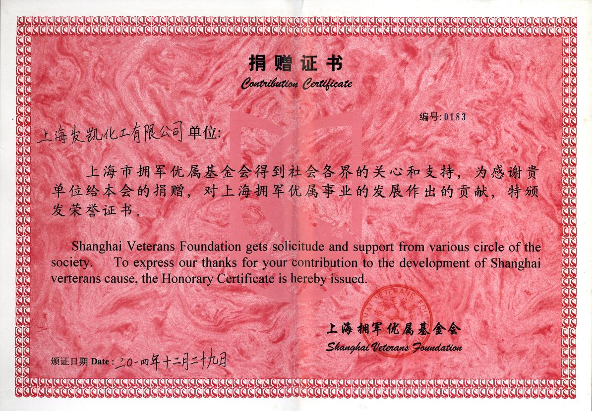 近日上海發(fā)凱化工有限公司向上海市擁軍優(yōu)屬基金會進行了捐贈,用于部隊及擁軍優(yōu)屬等文化建設(shè)。